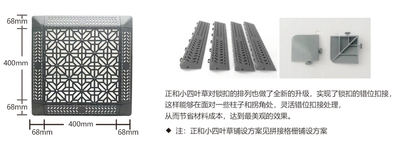 正和小四葉草采用通扣設計,可以確保產(chǎn)品鋪設完成后在任何區域單獨取出,極大的方便了客戶(hù)后期局部清理泥沙等,給店面的日常衛生維護提供了很好的基礎。