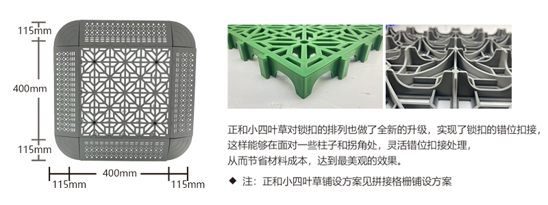正和小四葉草采用通扣設計,可以確保產(chǎn)品鋪設完成后在任何區域單獨取出,極大的方便了客戶(hù)后期局部清理泥沙等,給店面的日常衛生維護提供了很好的基礎。