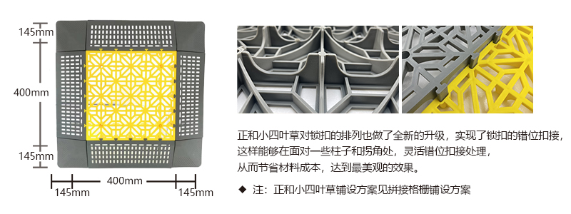 正和小四葉草采用通扣設計,可以確保產(chǎn)品鋪設完成后在任何區域單獨取出,極大的方便了客戶(hù)后期局部清理泥沙等,給店面的日常衛生維護提供了很好的基礎。