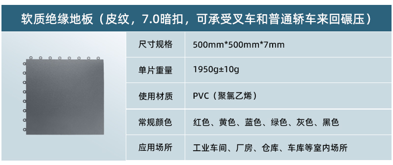 5、高承載,更防滑: 軟質(zhì)絕緣地板為實(shí)心結構,只要地面承重沒(méi)有問(wèn)題,其承載能力能夠達到每平米10噸以上。地板表面在生產(chǎn)過(guò)程中帶有凸起的紋路,讓車(chē)間地面更為防滑。