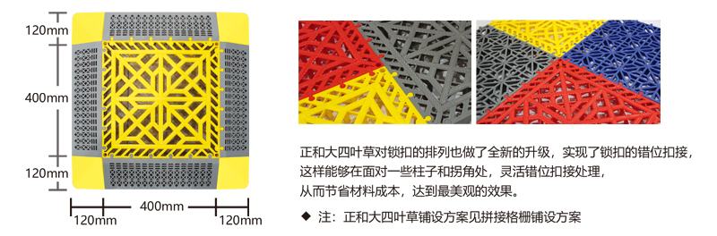 正和大四葉草采用通扣設計,可以確保產(chǎn)品鋪設完成后在任何區域單獨取出,極大的方便了客戶(hù)后期局部清理泥沙等,給店面的日常衛生維護提供了很好的基礎。